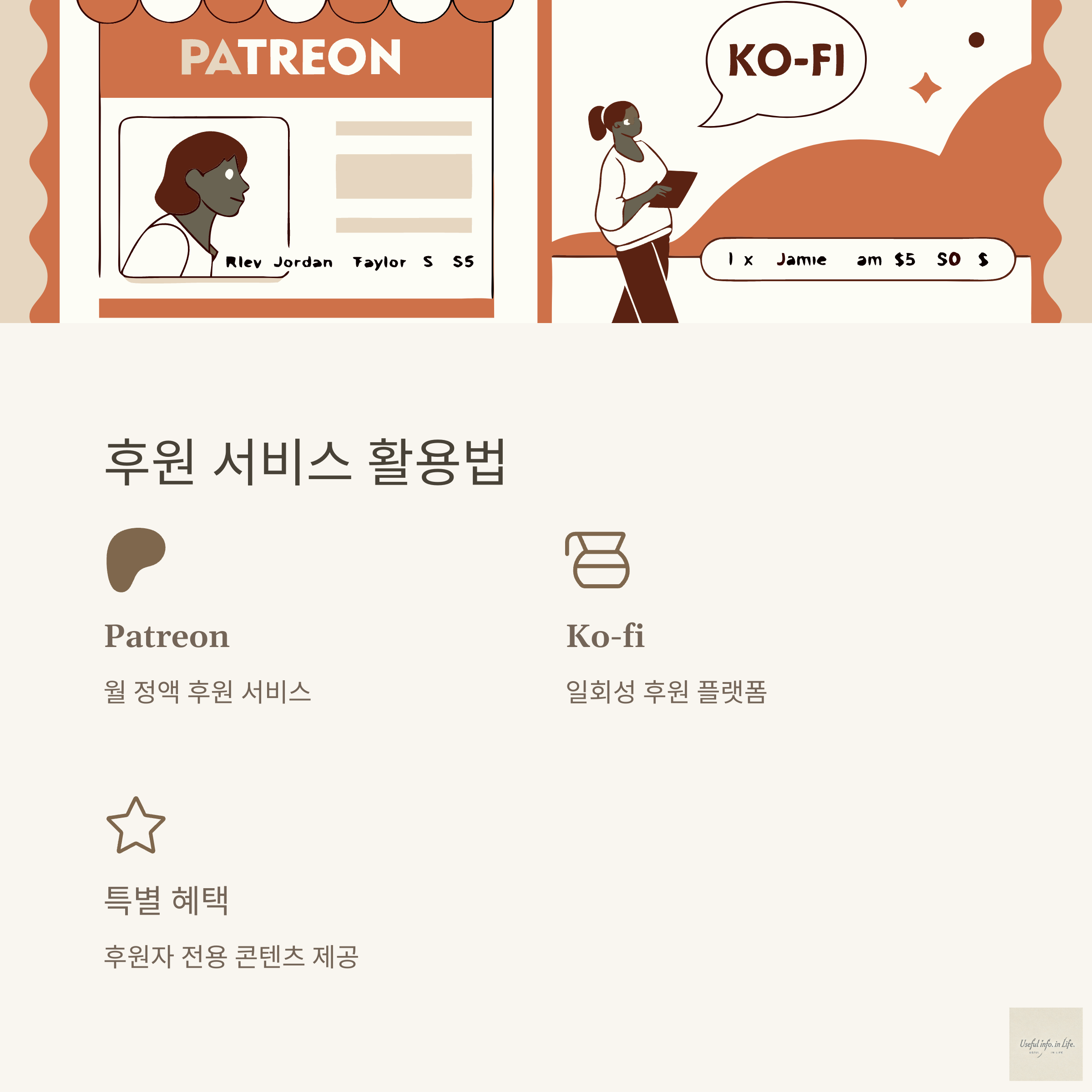 💡 예시: Patreon을 통해 팬들에게 월 정액 후원을 받거나, Ko-fi를 통해 일회성 후원을 받을 수 있습니다.