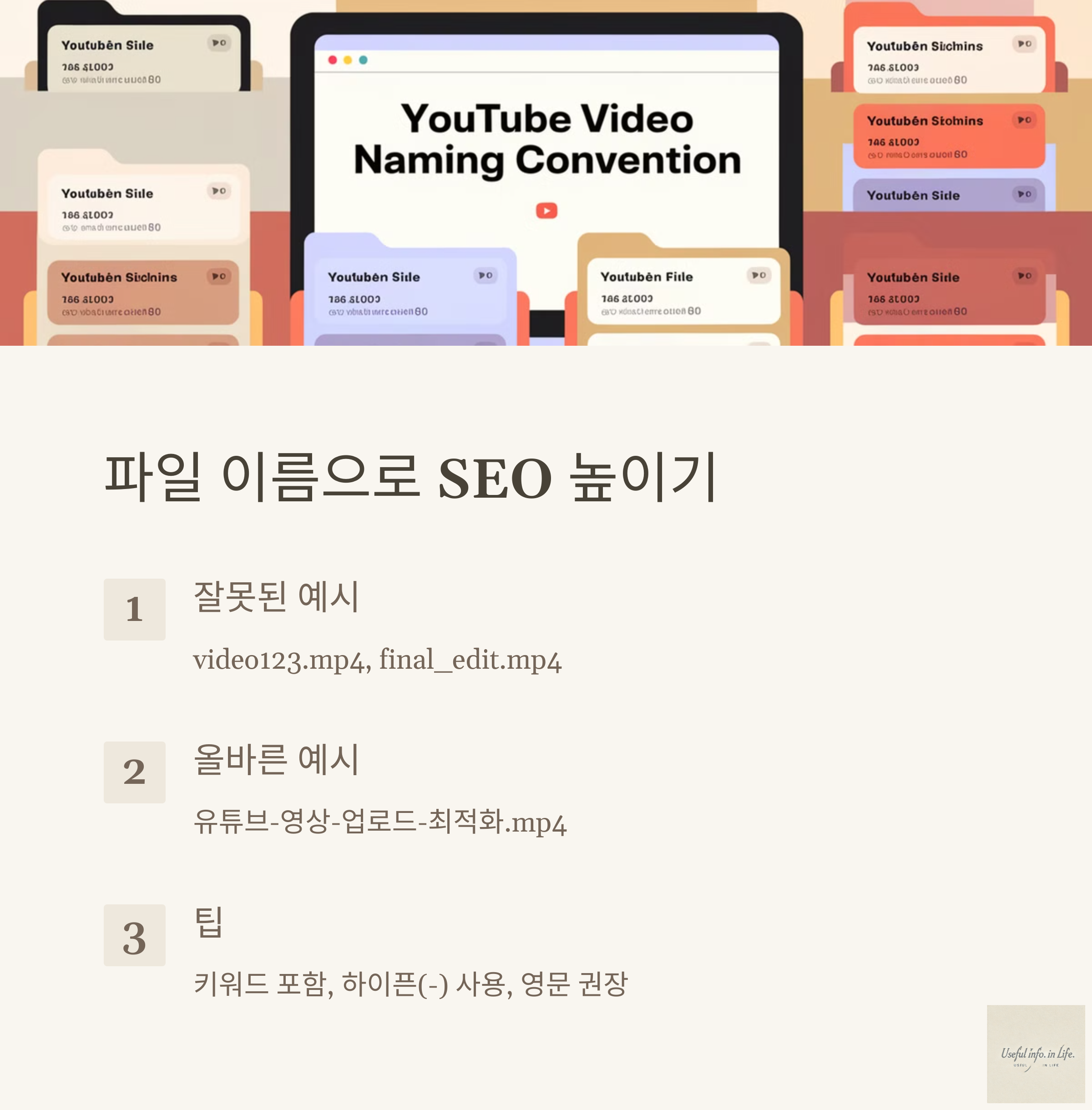파일 이름도 검색 최적화(SEO)에 영향을 줘요. 영상을 설명하는 키워드를 포함하면 좋아요.