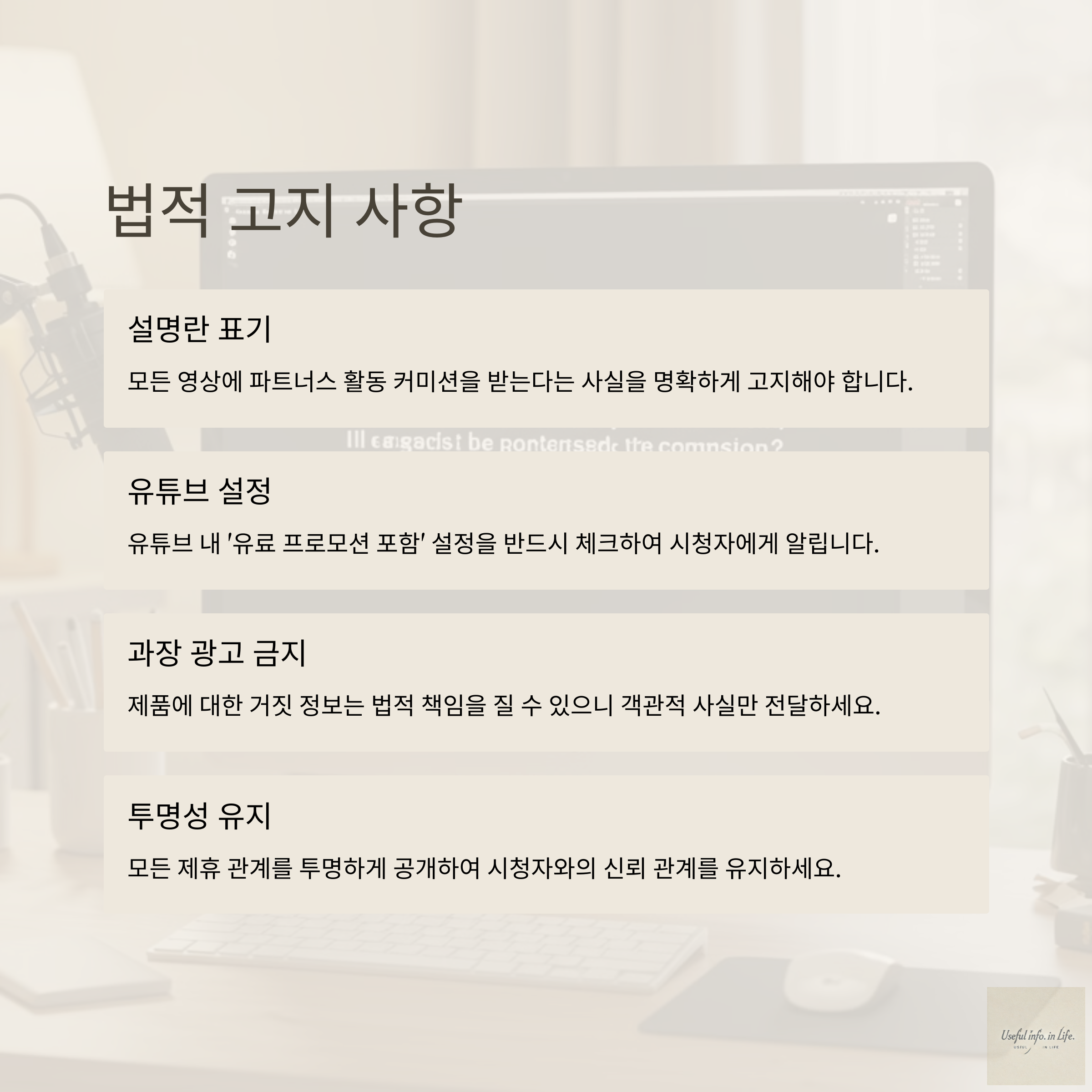 예) “해당 링크는 파트너스 활동을 통해 일정 커미션을 받을 수 있습니다.” - 광고 표시는 유튜브 설정에서도 체크
