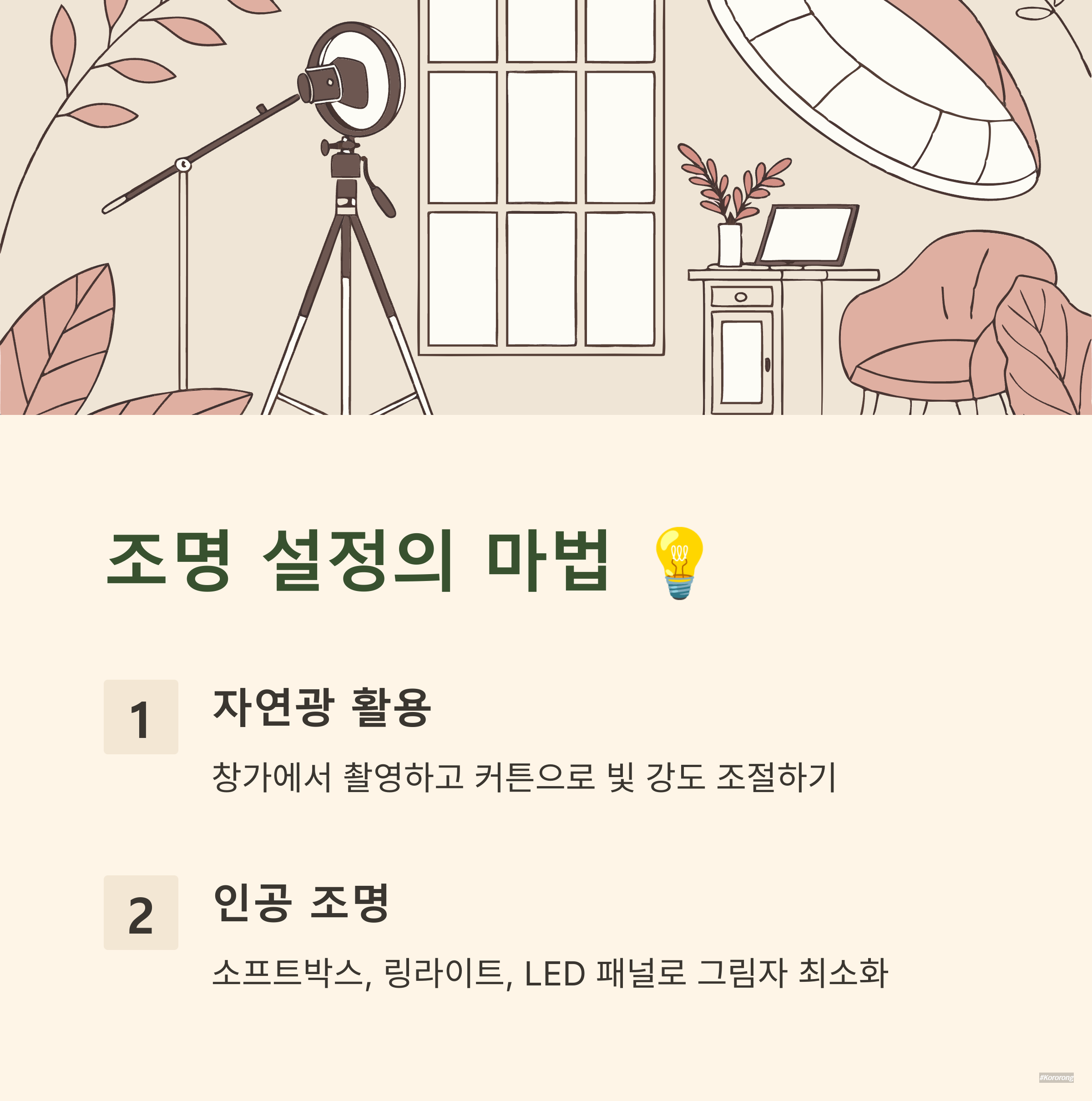 - 팁: 창문 옆에 촬영 장소를 설정하고, 햇빛이 직접적으로 들어오지 않는 시간대를 선택하세요. 커튼이나 블라인드를 활용하여 빛의 강도를 조절할 수 있습니다.