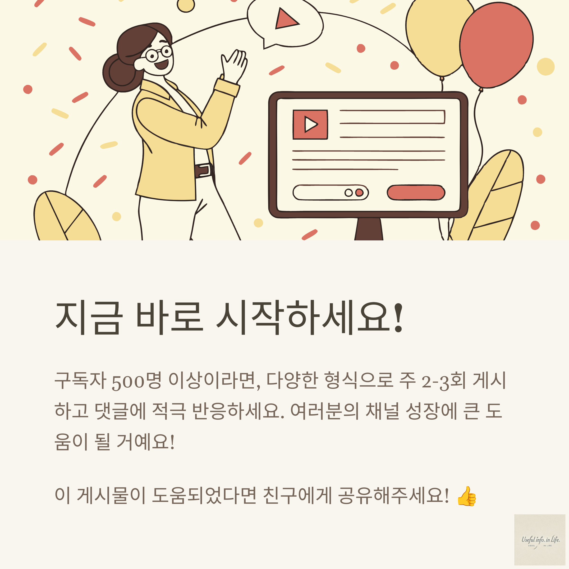 • 구독자가 활발한 시간대(저녁 7~10시)에 올리면 반응이 좋아요.