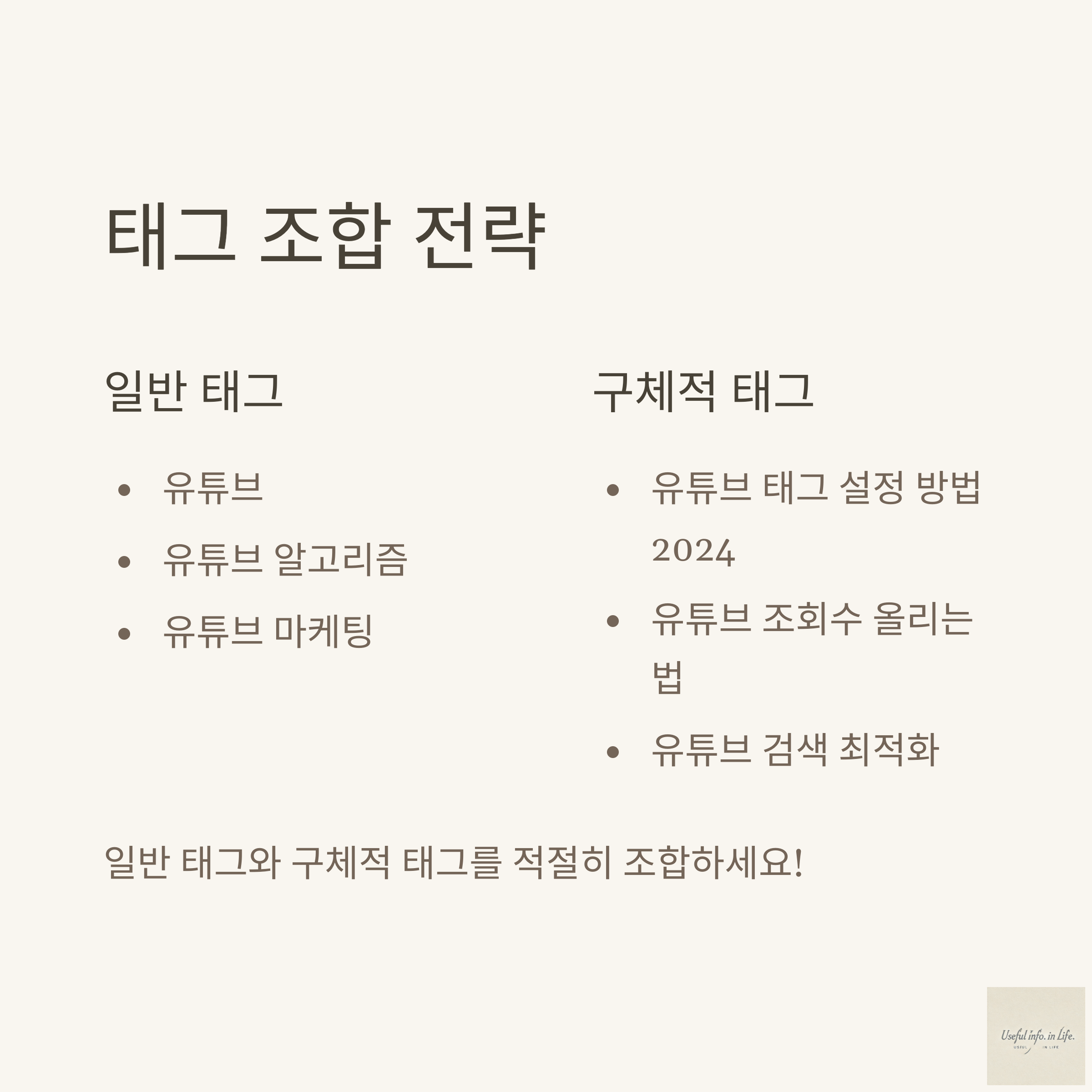 ✅ 구체적인 태그: 유튜브 태그 설정 방법 2024, 유튜브 조회수 올리는 법, 유튜브 검색 최적화