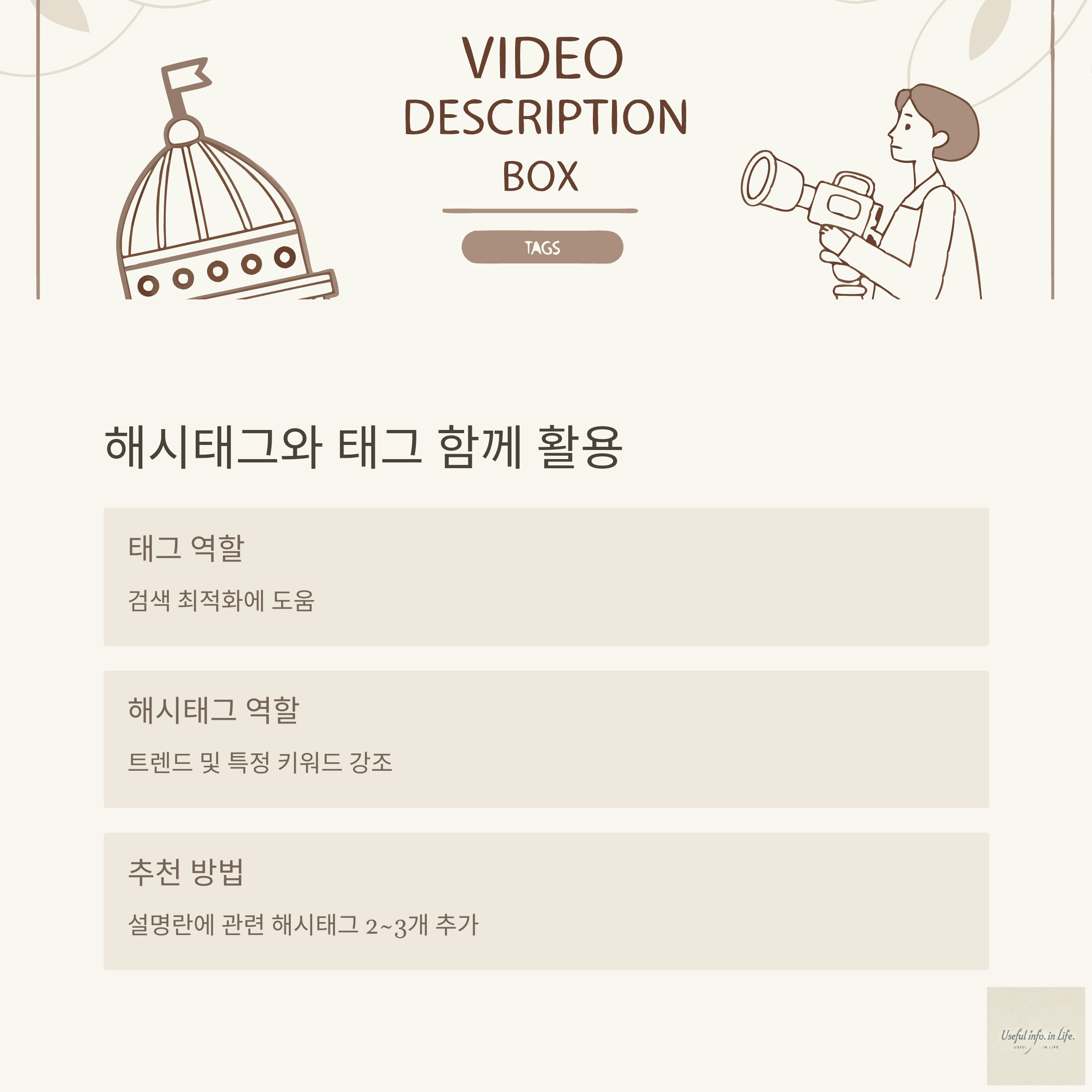 설명란에 #유튜브태그 #유튜브SEO 같은 해시태그를 추가하면 유튜브가 콘텐츠를 더 잘 분류할 수 있어요.