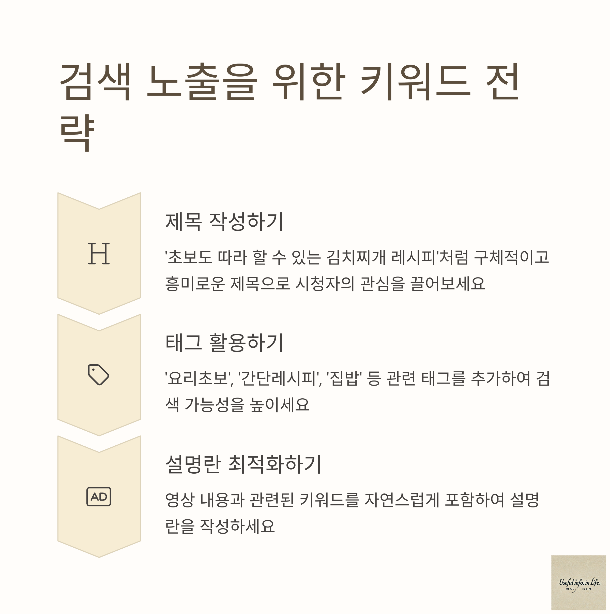 🔍 제목: '초보도 따라 할 수 있는 김치찌개 레시피'처럼 구체적이고 흥미로운 제목을 사용하세요.