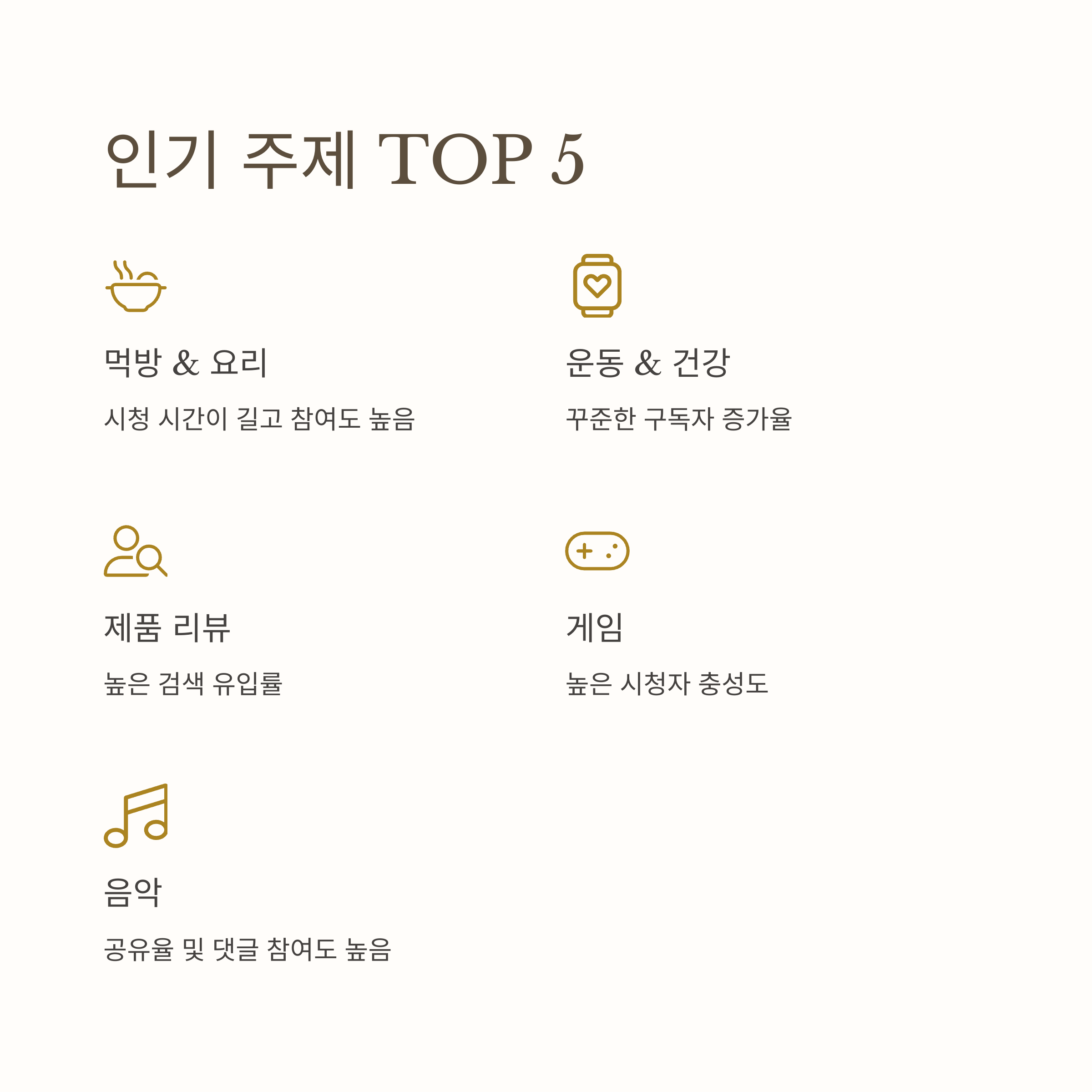 이 주제들은 시청 시간과 구독자 증가율이 높다는 공통점이 있어요.