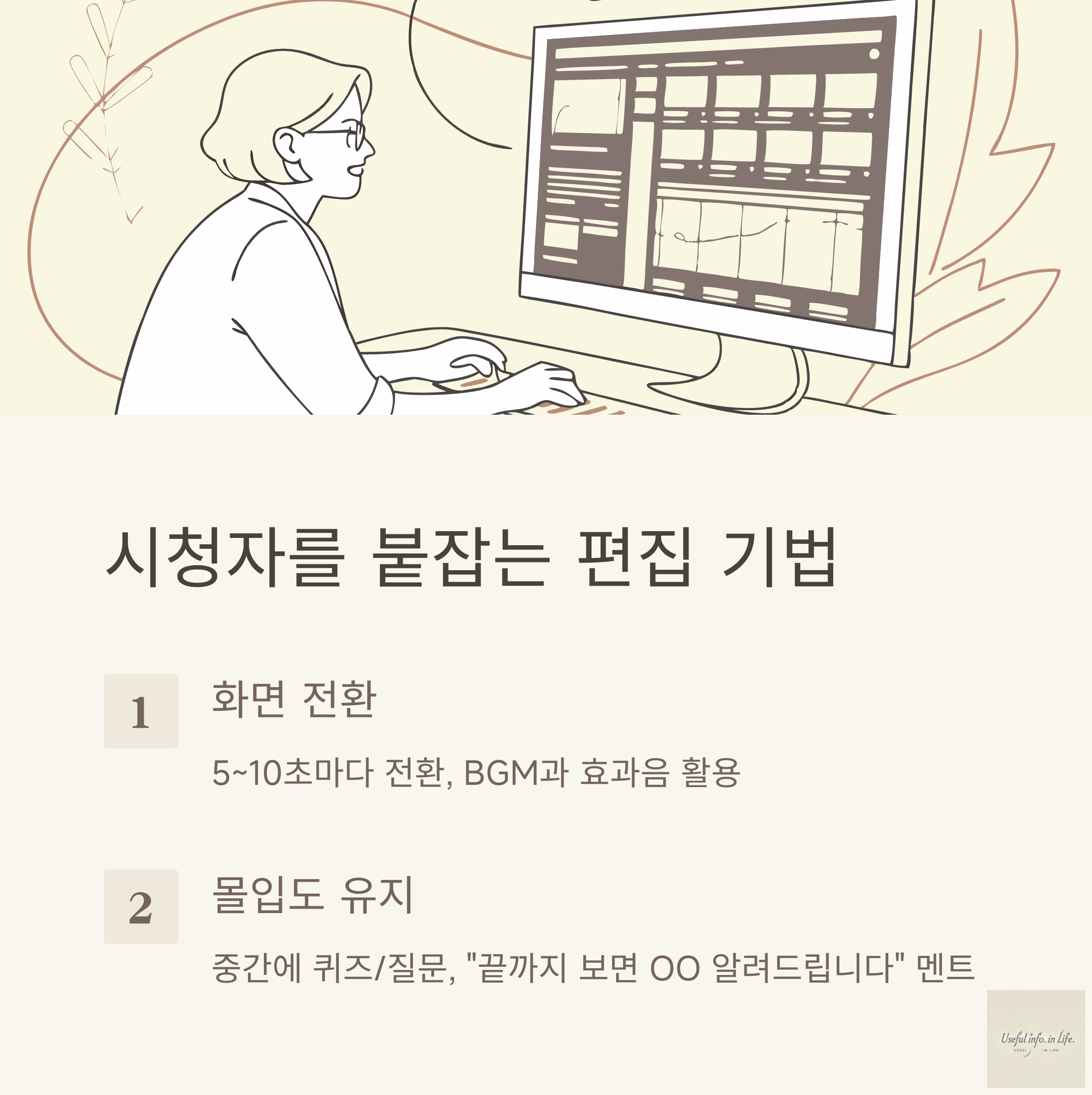 - 자막, 효과음, 빠른 화면 전환으로 몰입도 높이기
